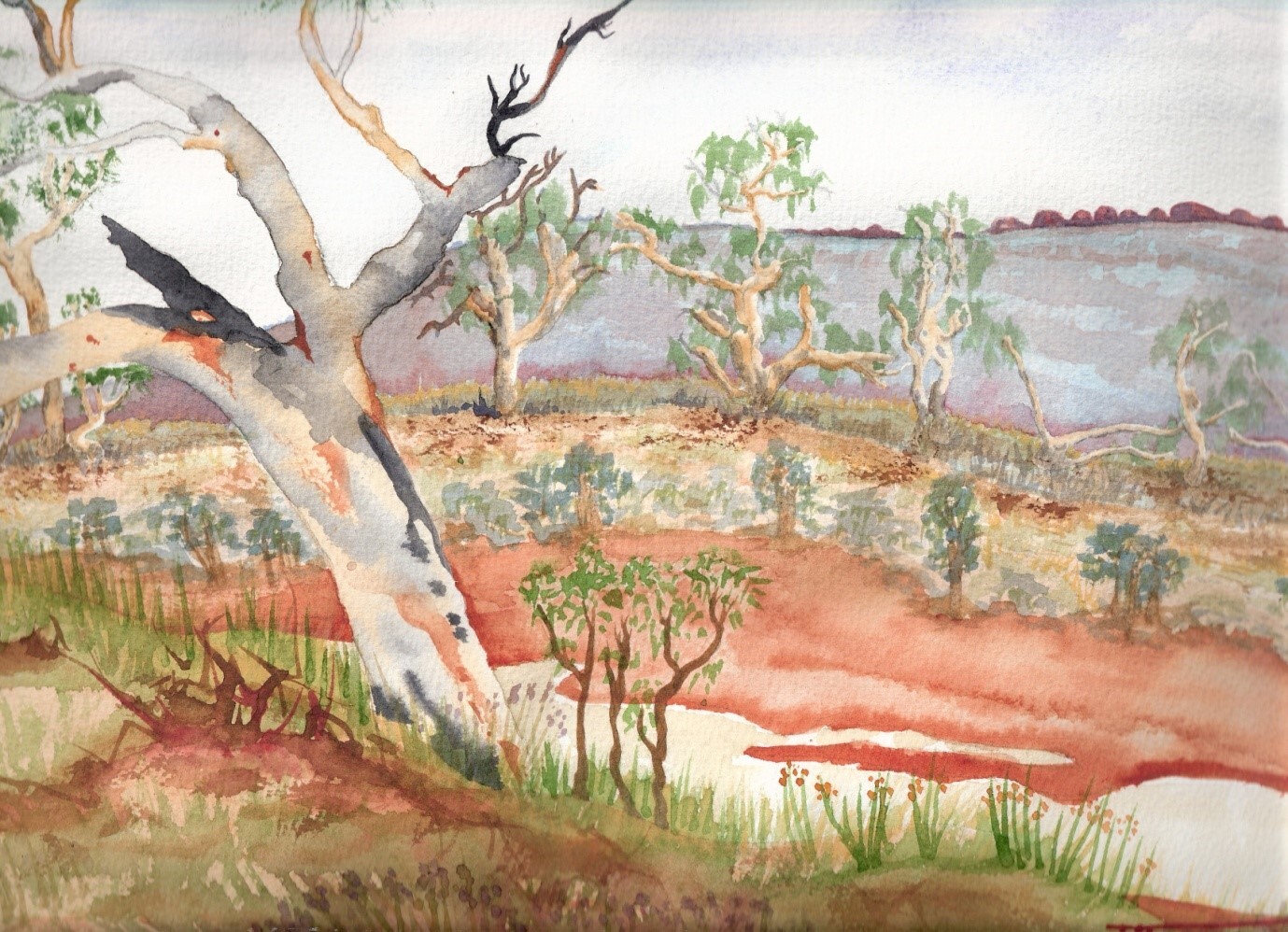 This painting celebrates the joy of living in Alice Springs with its close proximity to the ranges, waterholes and the stunning beauty of the Central Australian landscape, an unending inspiration for the visual artist.