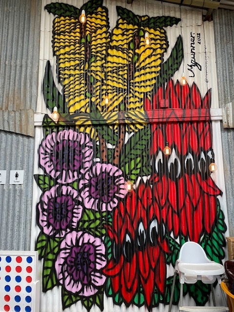 This commissioned mural depicts some favourite flowers of the local Watertank Cafe, including Desert Peas, Desert Roses and Yellow Bottle Brushes.