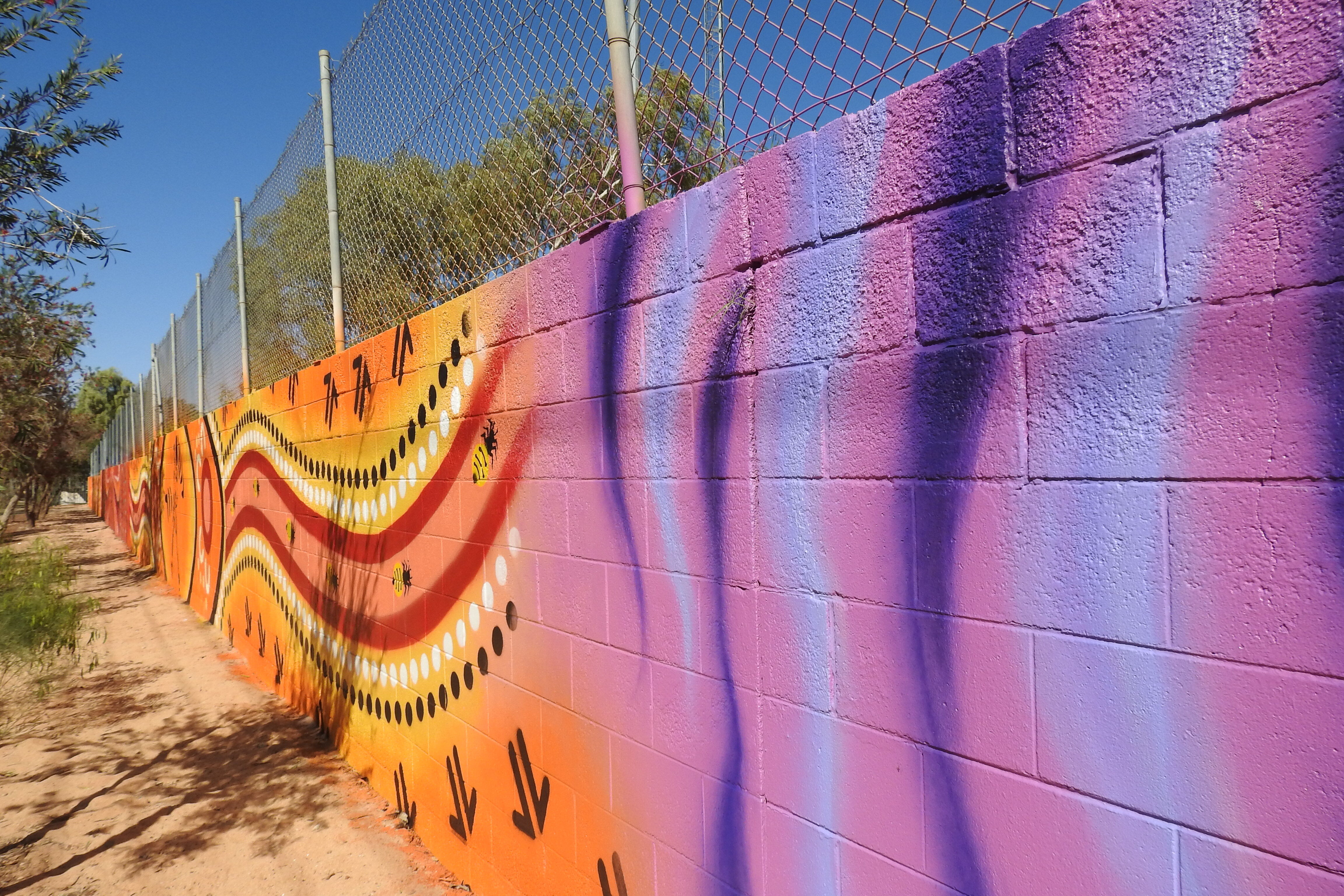 The Traeger park mural was created with the support of Alice Springs Town Council with the input of local Indigenous traditional owners from Hidden Valley and children from the Gap Youth Centre. It is a representation of 8 different sports that are played in the Traeger Park sports precinct interwoven with specific symbols representing local bush tucker, cultural tools tied together with brightly coloured dotwork. The Mural was delivered over 10 weeks with the support of the Gap Youth Centre to engage local kids in the installation process.