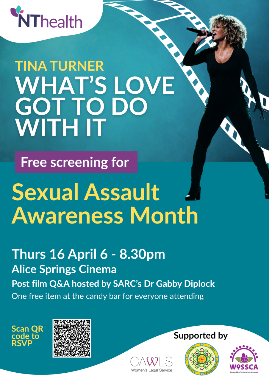Join Sexual Assault Referral Centre (SARC), Women’s Safety Services of Central Australia (WoSSCA), and Central Australia Women’s Legal Service (CAWLS) for a powerful movie screening of Tina Turner's Life Story as part of Sexual Assault Awareness Month. Dive into the story behind the title and explore important themes around love, consent, and courage. It's a great chance to learn, reflect, and connect with others in a supportive space. Don’t miss out on this meaningful event!