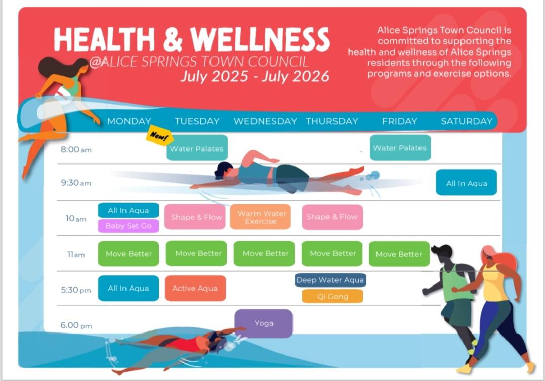 Alice Springs Town Council offers a comprehensive Health & Wellness Program designed to promote physical activity, social connection, and overall wellbeing among residents of all ages and abilities. The program encompasses a diverse range of free or low-cost classes, outdoor activities, and inclusive events. From gentle exercise sessions for those managing chronic conditions to energetic aqua classes and parent-friendly fitness programs, the initiative caters to a wide variety of needs and fitness levels. Specialised activities are available for seniors, youth, and people with disabilities, with an emphasis on fun, accessibility, and connection. Programs are held at various community venues, including parks and the Alice Springs Aquatic and Leisure Centre, helping make health and wellness accessible and enjoyable for all.