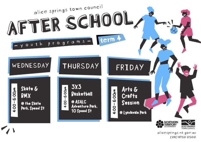 What's On? ASTC are running free after school activities for young people at the Speed Street Skate Park and Adventure Park in Alice Springs and the Lyndavale Park in Larapinta right across Term 4.